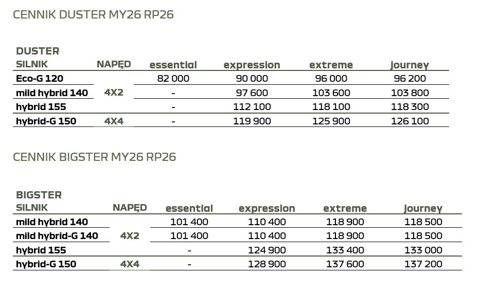 Dacia rozszerza ofertę napędów w modelach Duster i Bigster, wprowadzając układ HYBRID G 150 4×4, a także nowe wersje Eco-G 120, hybrid 155 i mild hybrid 140.