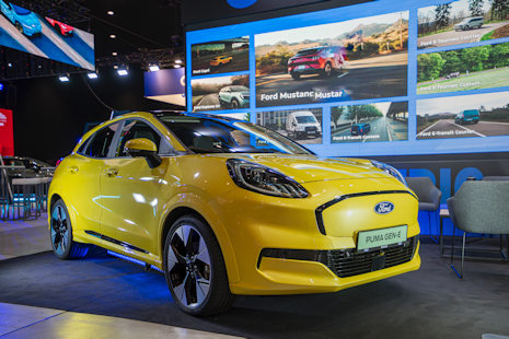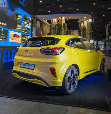 Obok Pumy Gen-E na ekspozycji znajduje się interaktywny ekran informacyjny prezentujący pełną ofertę samochodów elektrycznych: Capri, Explorer, Mustang Mach-E, E-Tourneo Courier, E-Transit Courier, E-Tourneo Custom, E-Transit Custom oraz E-Transit.
