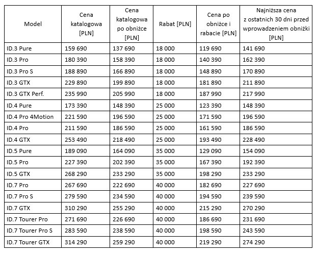 Cennik kompaktowego Volkswagena ID.3 rozpoczyna się obecnie już od 137 690 zł za odmianę z akumulatorem o pojemności 52 kWh. SUV-y ID.4 oraz ID.5 z tym samym akumulatorem dostępne są w cenach odpowiednio 148 390 zł oraz 164 090 zł, co w przypadku każdego z tych modeli oznacza oszczędność o ponad 20 000 zł względem poprzedniego cennika. Flagowa, komfortowa limuzyna Volkswagen ID.7 z akumulatorem o pojemności 77 kWh kosztuje obecnie od 222 690 zł oraz 226 690 zł w odmianie Tourer, co oznacza cenę niższą o 45 000 zł.