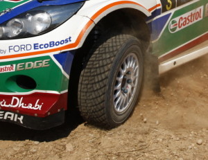 Natomiast na osi przedniej napędzanej sytuacja jest odmienna. Podczas napędzania auta klocki bieżnika opony oddziałują na asfalt zawsze od strony krawędzi natarcia powodując jej podcieranie. W przypadku hamowania klocki bieżnika opon przednich podcierają się z przeciwnej strony tak jak w oponach tylnych. Tak więc na osi napędzanej klocki bieżnika są ścierane z dwóch kierunków, co powoduje ich równomierne ale przyspieszone zużycie.